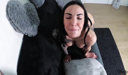 Брюнетка с тату и в белье не отказала парню в домашнем минете на камеру
