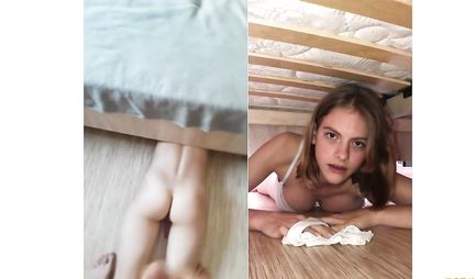 Девушка залезла под кровать и парень трахнул ее секс игрушкой в кремовую киску