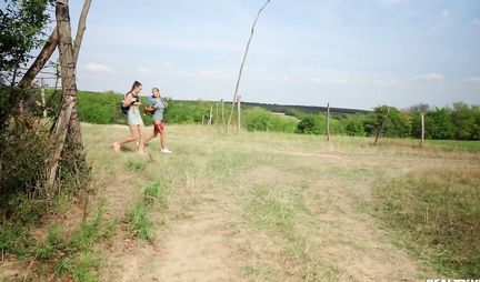 Две очаровательные туристки не против групповухи на природе