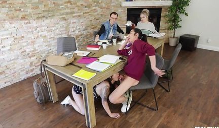 Быть студентом университета не всегда весело, а зачастую и вообще скучно. Вот взять хотя бы Дэвида Ли, который в субботний день изучает литературу на специальных занятиях. И если бы с ним вместе не было любимой подруги, тот точно помер бы со скуки. К счастью девушка не дает ему это сделать и забравшись под стол сосет член дружка, невзирая на соседей. Позже парочка находит какую-то комнату где можно тихо и спокойно потыкаться...