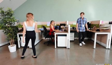 Парень на пару с любимой девушкой работает в одной конторе. Но там же трудится и симпатичная блондиночка с ангельскими чертами лица и с голодной до секса дыркой между ног. По ходу дела она как может соблазняет молодчика на секс в рабочее время, а тот не видит возможости отказаться, потому что он не какой-то полупокер, а вполне нормальный пацан. Ну а чтобы невеста паренька не сильно ревновала, блондинка соблазняет и ее на лесбийский секс в туалете. Только представьте как нравится пацану дрючить сразу двух зазноб в офисе, вот только вряд ли это понравится управляющему. Впрочем пока об этом не известно...