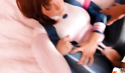 Рыжая азиатка в латексном белье трахает парня глубокой глоткой крупным планом