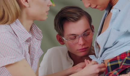 Студентки в коротких юбках ботана в очках на групповушку позвали