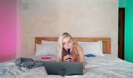 Худая блондинка мастурбирует киску игрушкой перед вебкамерой