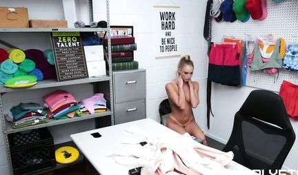 Брать чужое - нехорошо, а если ты не знаешь это, как симпатичная блондинка засветившаяся в торговом центре как воровка, то тебя быстро научат хорошим манерами эти симпатичные ребята из службы охраны. И девице очень повезло что она девушка и притом красивая, потому что ее просто оттрахали в кабинете, а могли бы отпинать ногами и забрать товар!