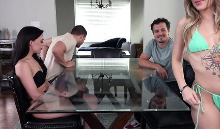 Две семейные пары решают снять дом на двоих. И все бы ничего, но горячая красотка вовсю флиртует не только с соседкой по дому, но и с ее мужем. В итоге девушки меняются парнями для группового порно по схеме два на два и похоже одним разом подобный эксперимент вовсе не ограничится - уж больно большое удовольствие получают участники милой домашней групповухи.
