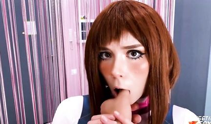 Рыжая азиатка в латексном белье трахает парня глубокой глоткой крупным планом