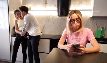 Похоже общения только с мачехой пареньку не хватает от слова абсолютно, а потому он приводит домой симпатичную соседку, забив болт на то факт, что неродная мамашка шарахается неподалеку в телефоне. По видимому с местоимением у парочки реальные проблемы, потому что они запросто трахаются за спиной милфы, ничуть не переживая по этому поводу. Ну а та не будь дурой шликает киску и вполне себе балдеет по своему.