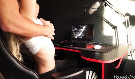 Да никто и не сомневается, что играть в Доту (а именно этим сейчас занята красивая блондинистая девица) в разы легче чем сосать большой пенис любимого мужа. Но в таком разе нефига была выходит замуж, а раз так получилось - то приходится девахе по первому же желанию открывать ротик, продолжая виртуальные баталии и даже трахаться с кремпаем, натурально проигрывая, что как бы знаково и по сути трахнули ее не только в игре, но и в реале.